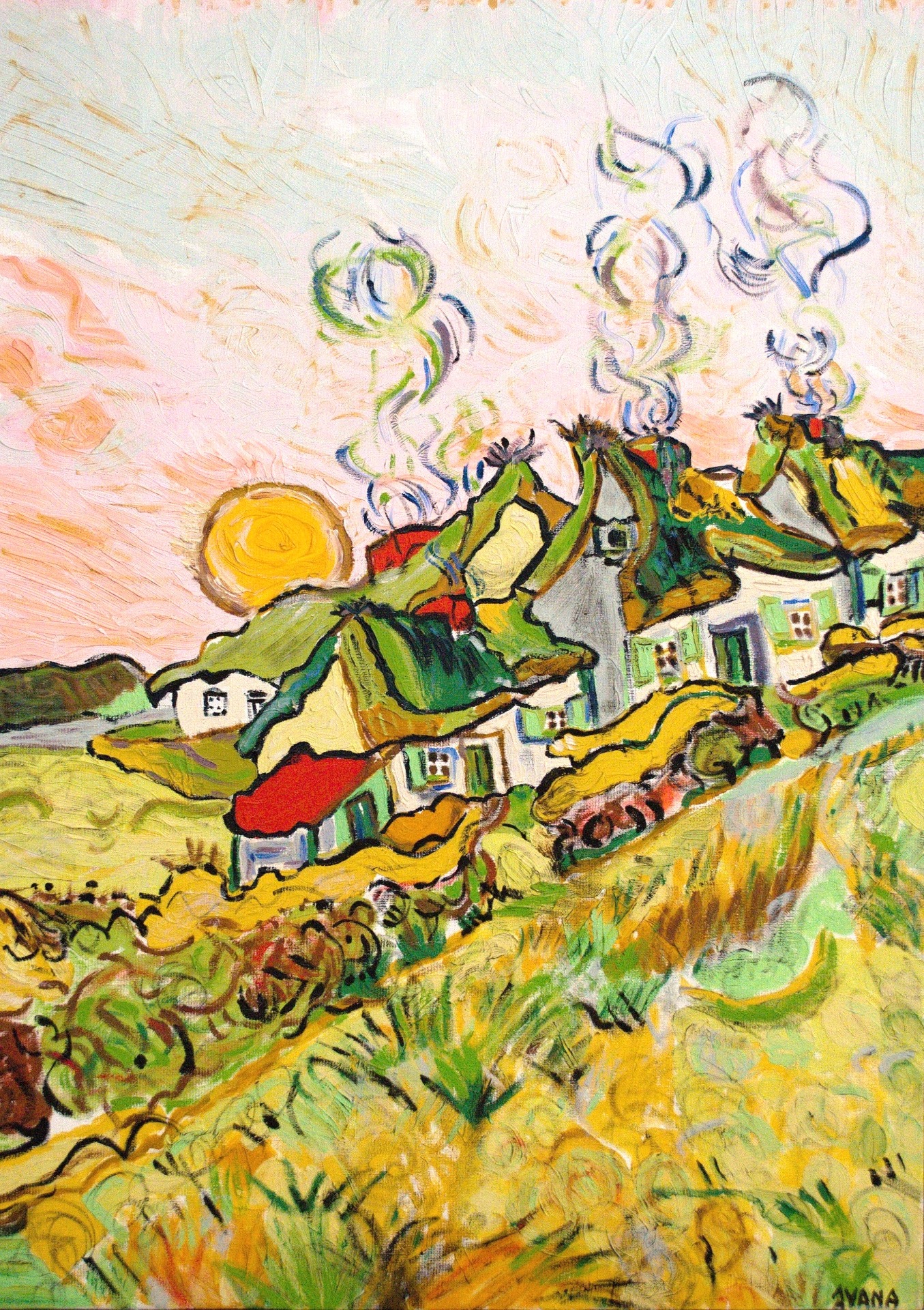 "SLAMĚNNÉ STŘECHY VE SLUNCI" olej na plátně, autorká replika, Vincent van Gogh, 50X70 cm